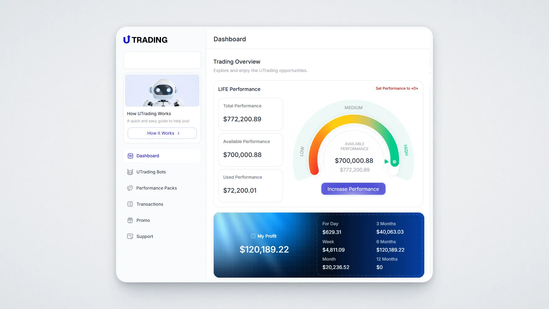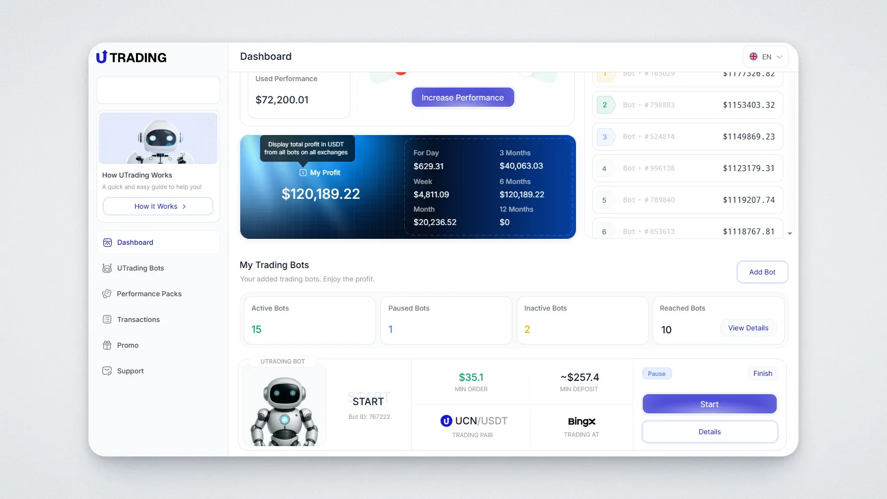 To start getting profit, you’ll need to add your first bot and purchase a Performance Pack. We’ll show you how to do this in just a few simple steps.