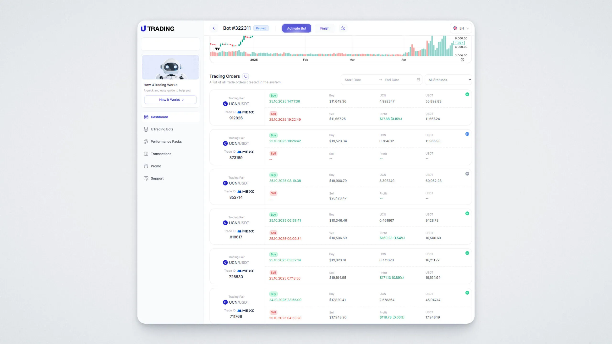 To start earning profit, you need to choose a bot and purchase a Performance Pack using UCN. For the bot to begin operating, you must create or connect an account on one of the supported cryptocurrency exchanges and fund it. Detailed instructions for creating accounts on BingX, MEXC, and HTX are available in the Help Center in the “Exchanges” section.