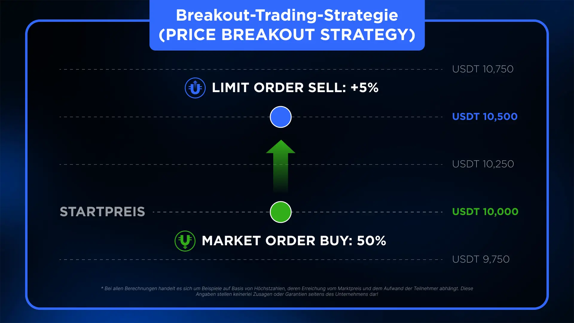 • Beispiel: Angenommen, Sie haben ein Performance Pack der Stufe 350 zum Preis von 605 USDT erworben. Bei einem Rückgang um 0,5 % gegenüber dem Startpreis von 10.000 USDT gibt der Bot eine Order über 6,05 USDT zum Marktpreis von 9950 USDT auf und platziert eine Limit-Order zum Verkauf 0,5 % über dem letzten Kaufpreis zu einem Preis von 9999 USDT.